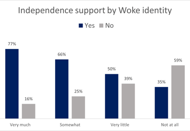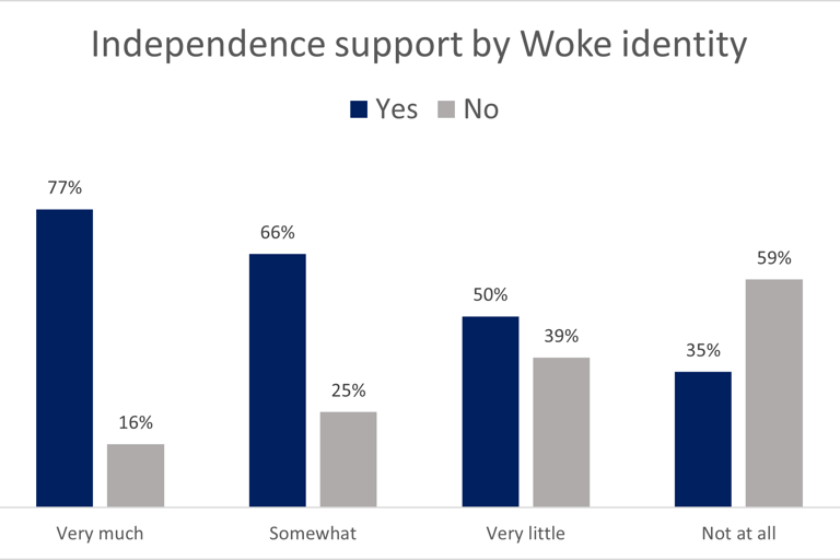 Woke is now defined as “aware of and actively attentive to important facts and issues (especially issues of racial and social justice)”. It originated in African American English and gained more widespread use beginning in 2014 as part of the Black Lives Matter movement. That was the same year as the Yes movement campaigned for a more equal and inclusive society; starting with the right to self-determination for all of us who live and work in Scotland. We spent the summer of 2014 imagining a better Scotland where we would control our own land and resources, along with the tools to address endemic poverty and injustice. It's no surprise then that being Woke is closely aligned with supporting Scottish independence. As you'll see from this chart, Yes support is highest among those who strongly identify as Woke, with a 77% to 16% margin among those who very much identify as Woke, and 66% to 25% among those who somewhat identify as Woke.